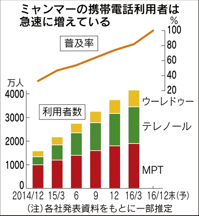 ミャンマー携帯普及率100 へ 外資参入で低料金に 日本経済新聞